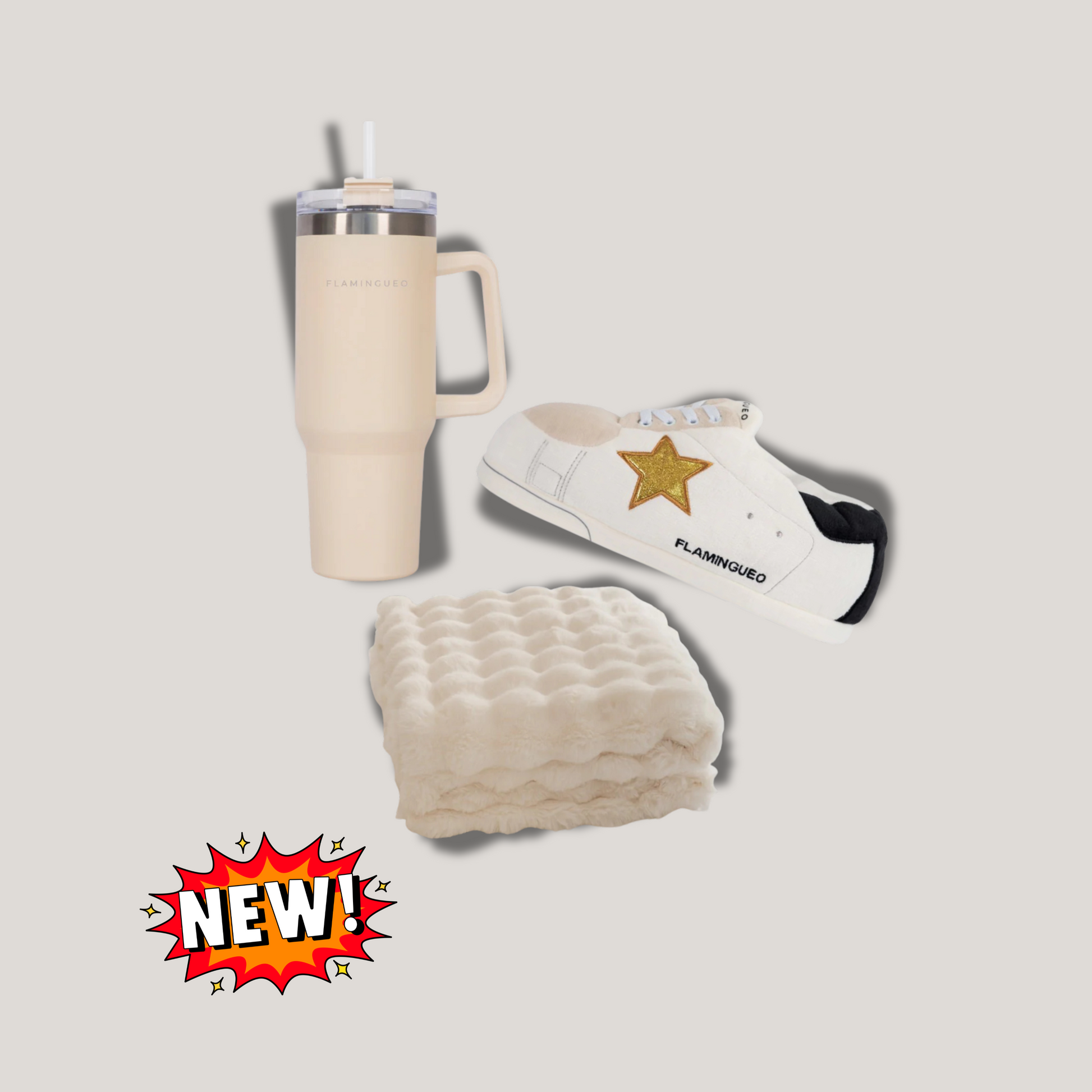 Smėlio spalvos gertuvė + šlepetės su žvaigžde + baltas minkštas pledas – tai stilingas ir funkcionalus komplektas, sukurtas komfortui bei estetikai. Smėlio spalvos gertuvė idealiai tinka tiek kelionėms, tiek darbui ar sportui. Šlepetės su žvaigžde suteiks jūsų namams išskirtinumo ir jaukumo, o baltas minkštas pledas taps nepakeičiamu šilumos akcentu vėsiems vakarams.
